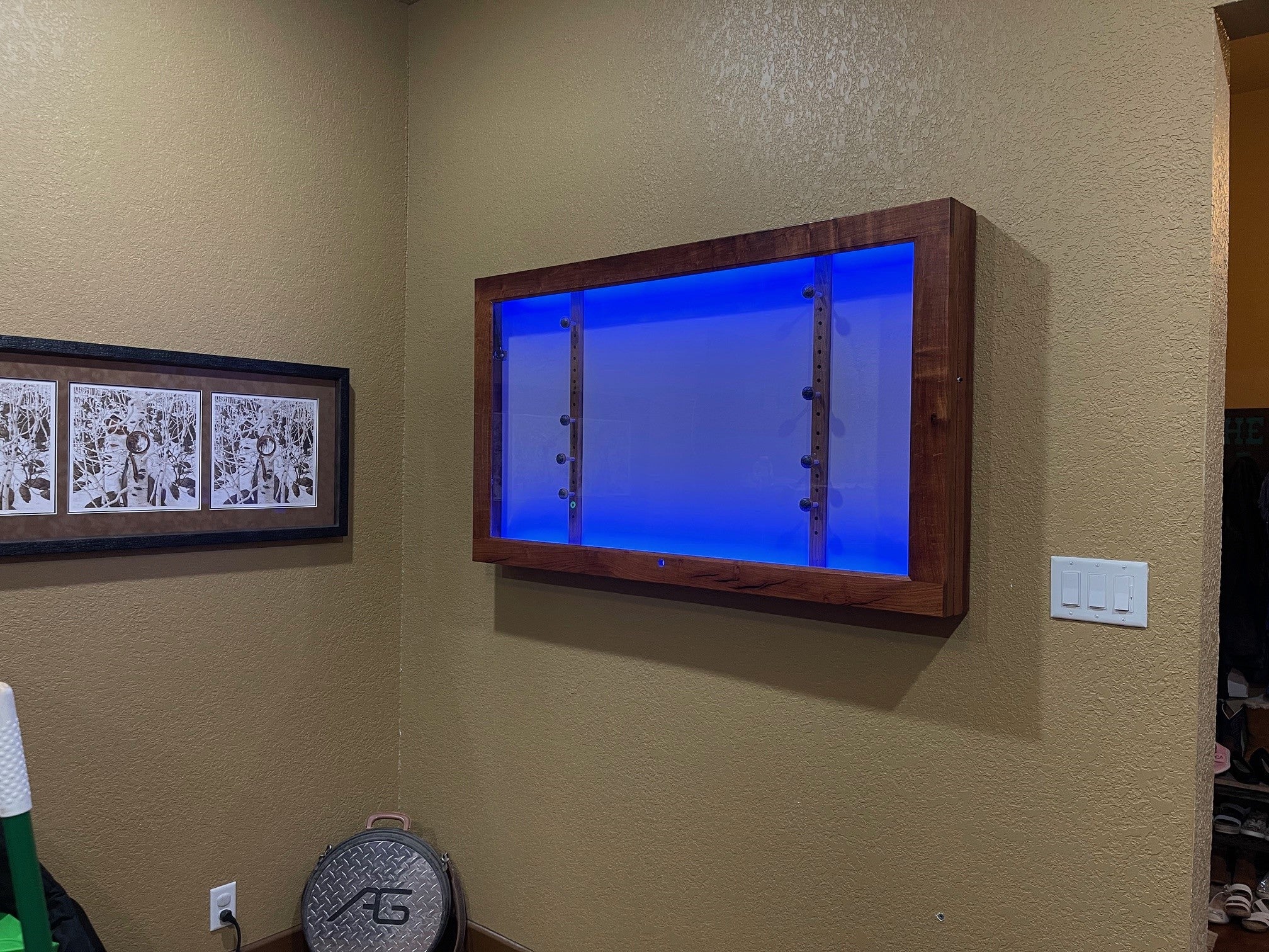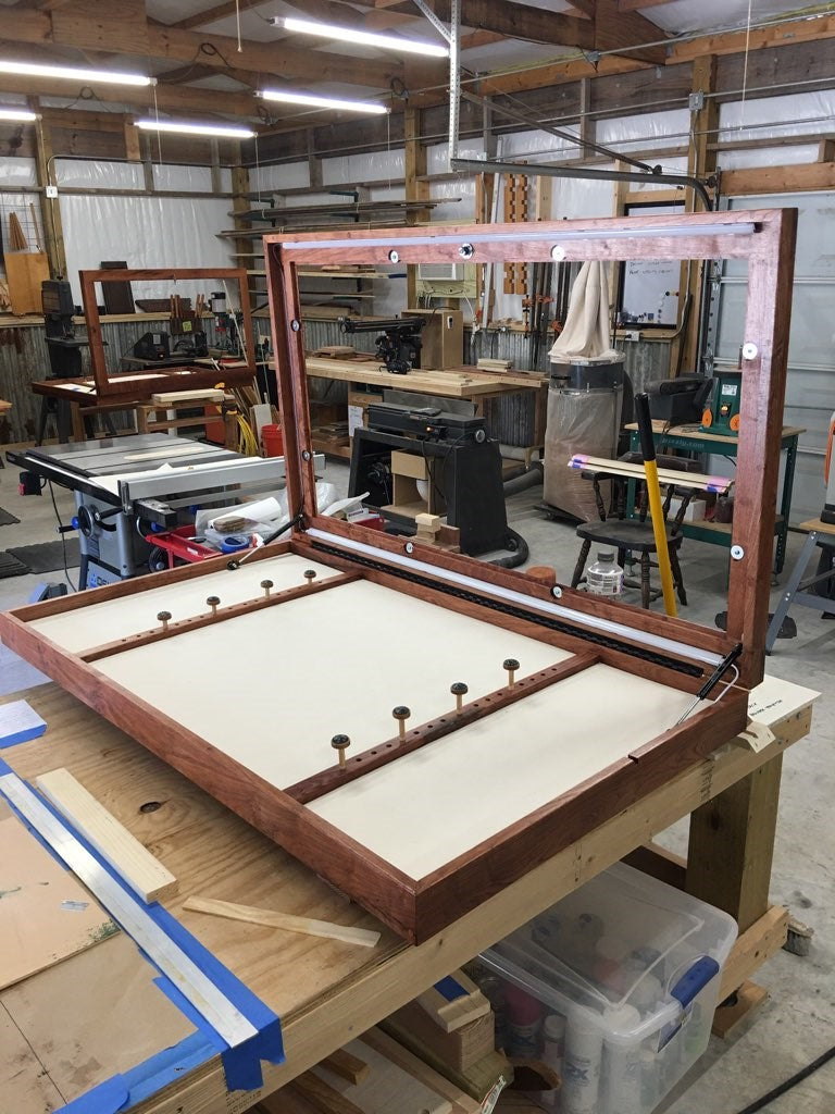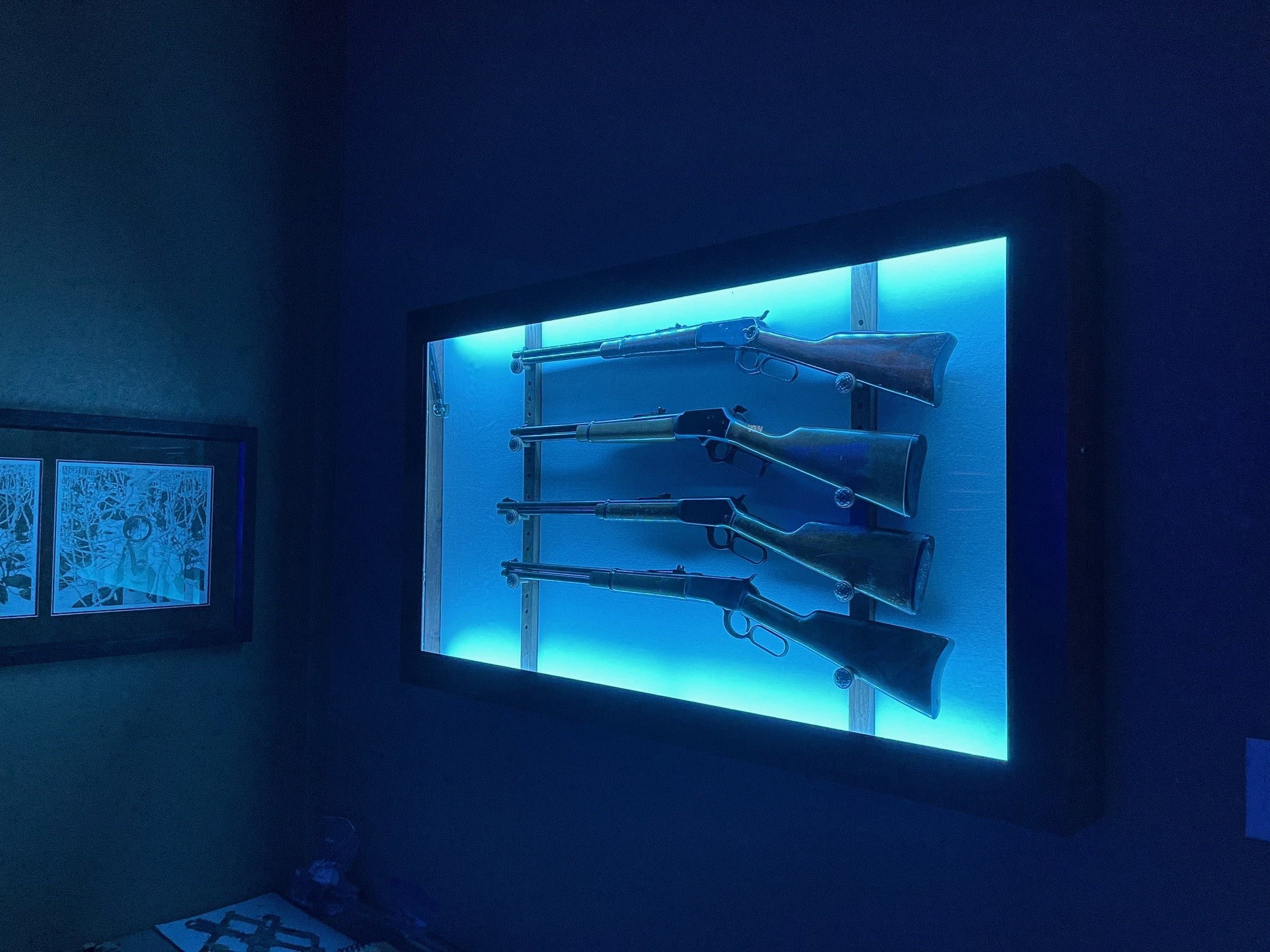 Texas Mesquite rifle display case with shock supports and LED lighting kit. As shown, $2,800. Contact us to purchase one of these unique cases.
